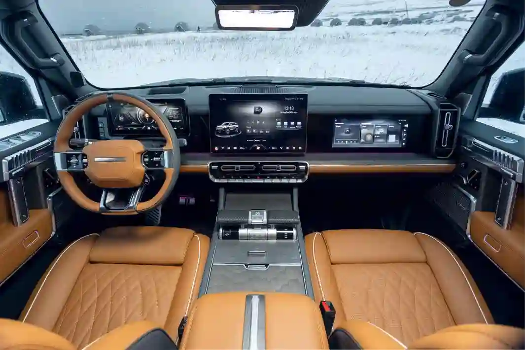 Интерьер для китайского автомобиля избыточно роскошен: натуральная кожа наппа, шпон из ценных пород дерева, электрорегулировка руля. Удивляет разве что отсутствие подогрева рулевого колеса и доводчиков довольно тяжелых дверей, за исключением багажной. Всё здесь с перебором по размеру — массивные кресла с массажем, подогревом и множеством регулировок, «самолетные» селекторы на широченном центральном тоннеле, глубокие подстаканники. Посередине — большущий тачскрин плюс еще два дисплея по бокам от него. Механическое превалирует над сенсорным — управление возложено на крупные клавиши и колесики, кресла регулируются «по-мерседесовски» тумблерами в форме сидений. Очень стильное решение — индикация режимов движения механическим барабанчиком под прозрачным стеклом. При этом двери изнутри открываются кнопками, не связанными с замками. Диван второго ряда делит пополам массивный откидной подлокотник с еще одним тачскрином — с его помощью можно независимо настроить части дивана, включить массаж. Можно изменить температуру климат-контроля, но тогда она поменяется и спереди, отдельной климатической зоны сзади нет. Печка, кстати, мощная, внутри тепло. Вся эта массивная мебель создает внутри немаленького автомобиля ощущение тесноты. Багажник и вовсе крохотный, хотя снабжен мощными петлями для крепления груза.