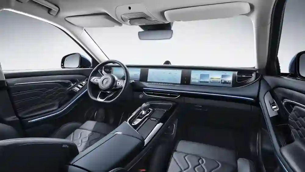 Салон Voyah Free, как и кузов, сделан без излишних нагромождений, призванных демонстрировать его премиальность. Традиционный центральный тоннель с джойстиком и рядом кнопок, удобный руль, приборная панель с тремя экранами. Есть и своя особенность: когда автомобиль выключен, весь блок приборной панели с мониторами и воздуховодами уезжает на несколько сантиметров вниз, как бы складываясь в недра приборной панели, а при включении зажигания выезжает обратно. Его можно выдвинуть и убрать также принудительно кнопкой на центральном тоннеле: в этом случае мониторы становятся чуть уже, но информация на них остается та же, но в виде минималистичных иконок. Производителем заявлена безотказная работа механизма на протяжении 30 тысяч циклов.